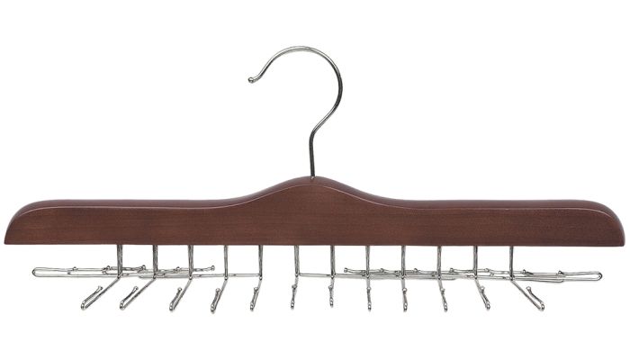 These sturdy, well-constructed hardwood tie hangers feature a space-saving flat body, swivel hook and 24 precision crafted clips for hanging ties. With a lacquered walnut finish and polished chrome hardware, these high quality, low cost accessory hangers are a great space-saving solution and also make terrific gifts.