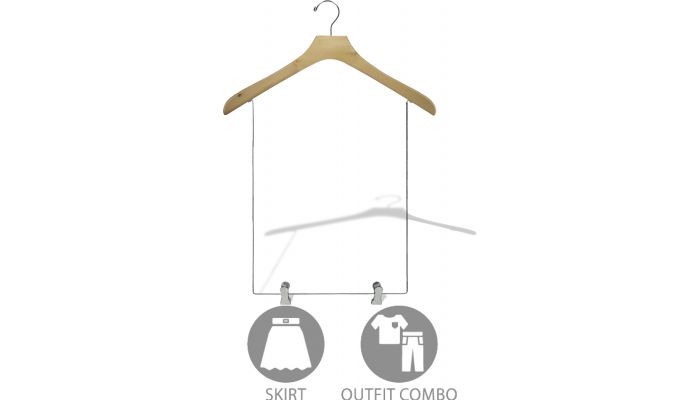 These heavy-duty hardwood hangers feature a curved body and a polished chrome hook. This style also features a 15 inch drop with deluxe clips for hanging bottom garments.